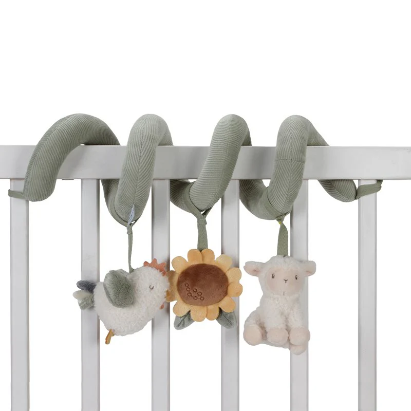 Look, feel, and discover! This fun and entertaining activity spiral will keep babies occupied both at home and on the go. This practical toy easily attaches to anything from a crib to a playpen or car seat. It stimulates the senses and promotes hand-eye coordination. Made from corduroy and cotton, the activity spiral revolves around a little sheep, a cheerful chicken, and a pretty sunflower.
