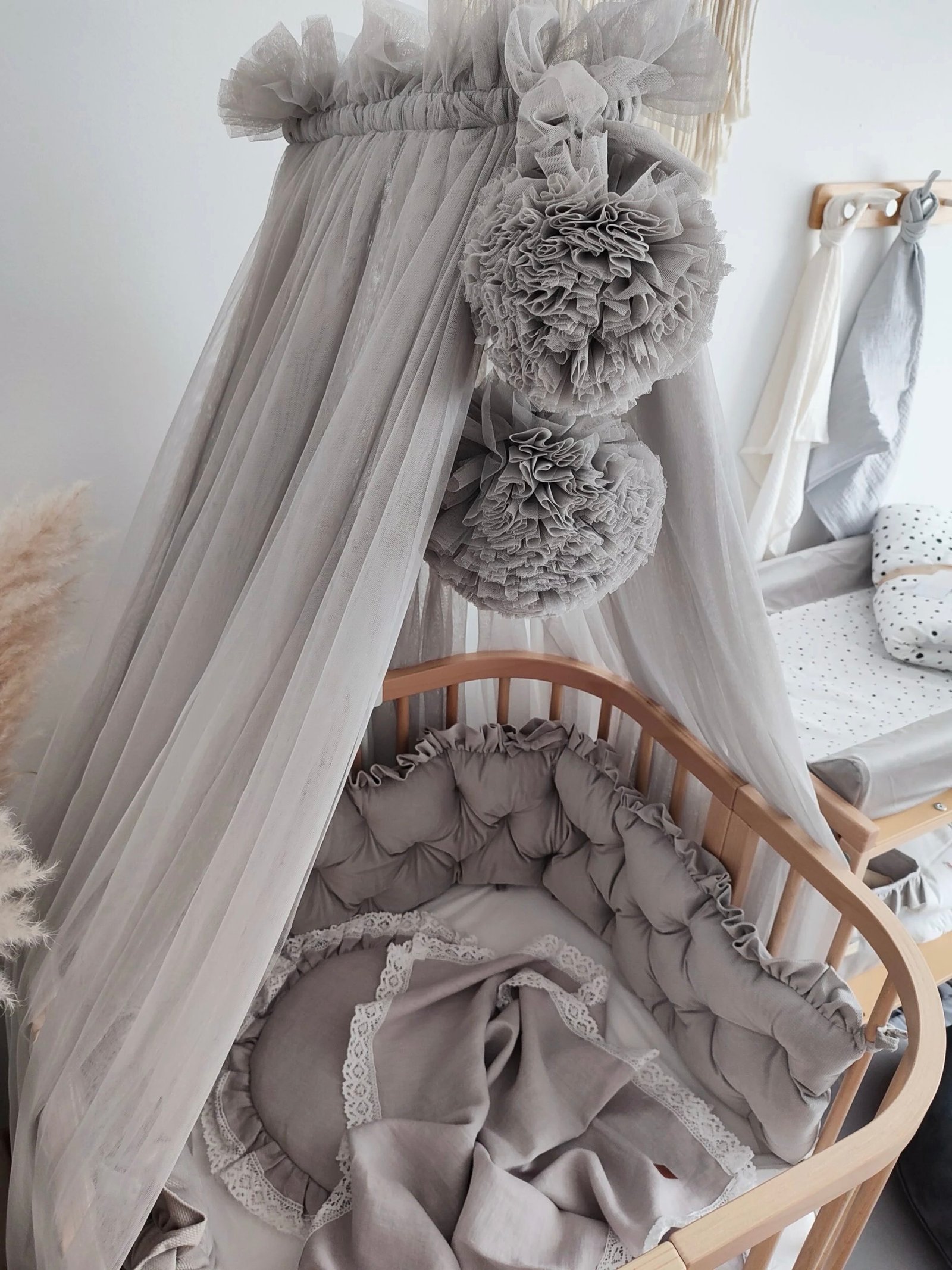 Gray tulle bed canopy with 2 pompoms