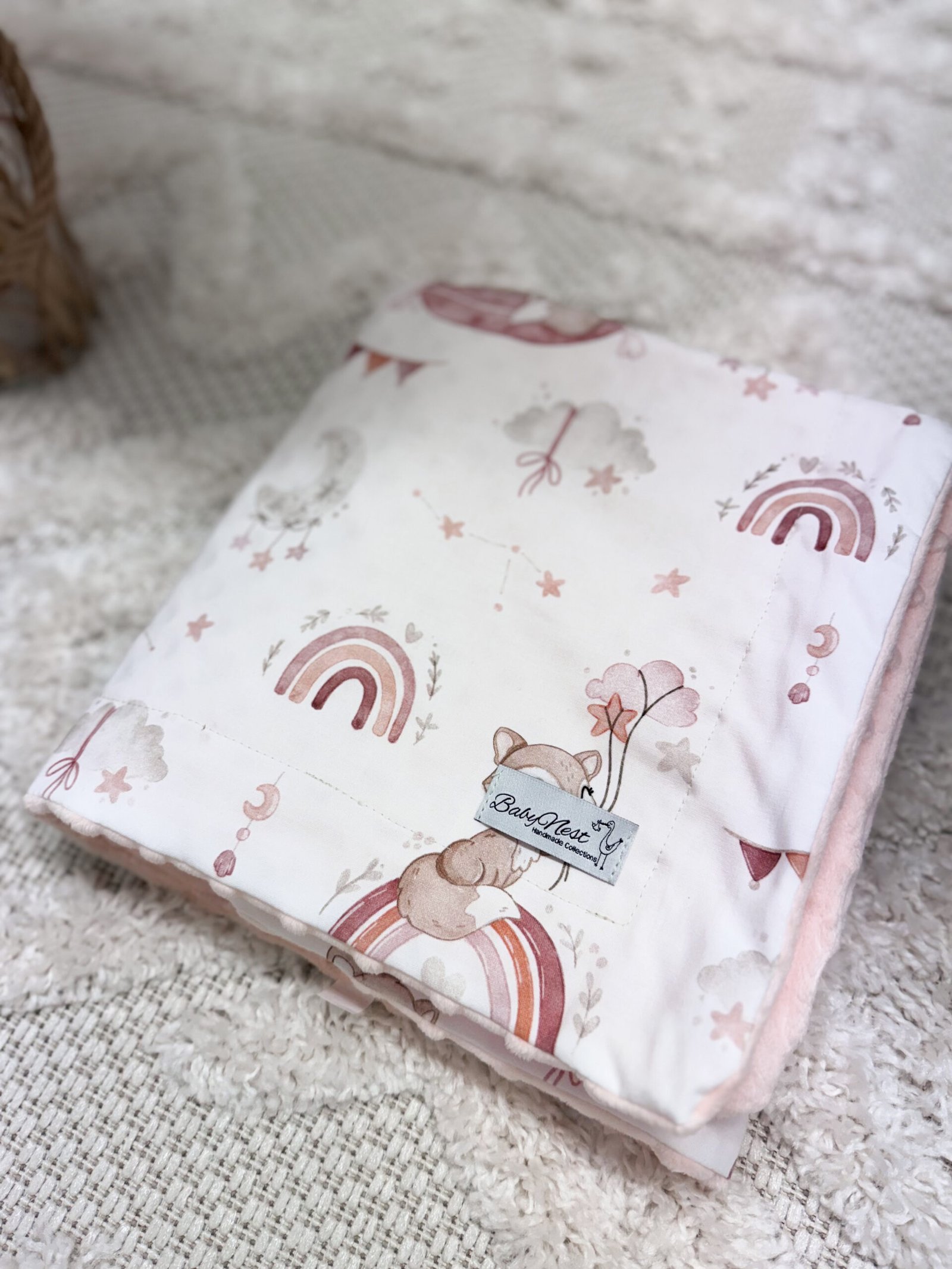 Double-sided blanket for the nursery, also ideal as a bedspread or cozy blanket for a nap. One side is made of premium cotton in one of our four patterns, and the other side is made of soft minky. The blanket is filled with hypoallergenic silicone fleece, making it extremely lightweight while providing comforting warmth. The blanket can be combined with a matching pillow to create a unique set for bedtime or the nursery! Washing and Care: • Machine wash at 30°C on a delicate cycle - max. 800 rpm. • Do not hand wash. • Do not bleach. • Do not tumble dry. We recommend drying flat. • It is recommended to wash according to the label instructions before first use. • Do not leave the washed product in direct sunlight for extended periods.