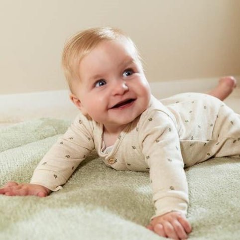 Enjoy loving me in style! This sweet boxing romper in a sand blend is decorated with a cute print of little green leaves. For easy changing, dressing, and undressing, it has a snap-open front with wood-look buttons. Made from soft organic cotton, it offers a comfortable fit for your little one. Pair it with a bodysuit for a coordinated mix-and-match look with other items from the Little Farm Collection. Available in sizes 56, 62, 68, and 74.