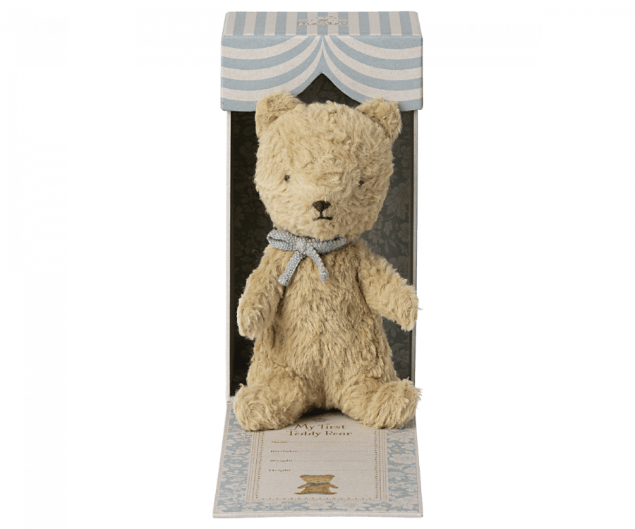 The perfect gift for any newborn. The fabric is very exclusive and gives the little teddy bear a cute vintage look. You can write the newborn's name, date, height and weight on the inside of the box.