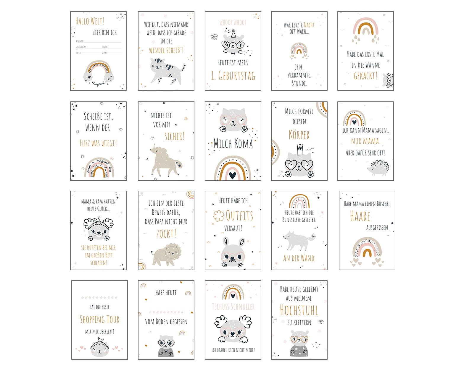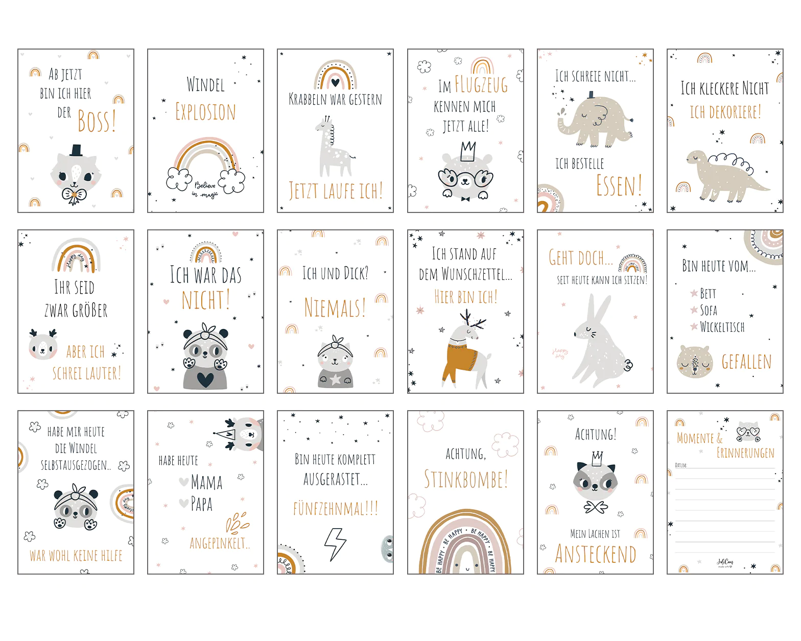 L'ensemble contient 35 cartes d'étape luxueuses recto-verso pour capturer tous les détails dont vous souhaitez vous souvenir pour toujours. Un superbe cadeau pour tous les nouveaux parents ! Excellente idée cadeau : nos cartes d'étape amusantes et honnêtes vous feront sourire et ne sont pas seulement destinées à enregistrer les étapes classiques. Mais surtout les moments où tout va mal, on a l'impression d'être dans un film parce que tout part en vrille ou qu'on ne sait même plus ce qui se passe. JOLIMENT EMBALLÉES Les cartes d'étape sont emballées dans une boîte souvenir joliment imprimée et constituent également un cadeau parfait pour les parents ayant le sens de l'humour. De cette façon, vous pouvez conserver les cartes en sécurité pour toujours et les retirer encore et encore. Au dos, vous pouvez écrire vos souvenirs et moments personnels pour chaque étape afin de pouvoir vous en souvenir encore et encore si nécessaire :)