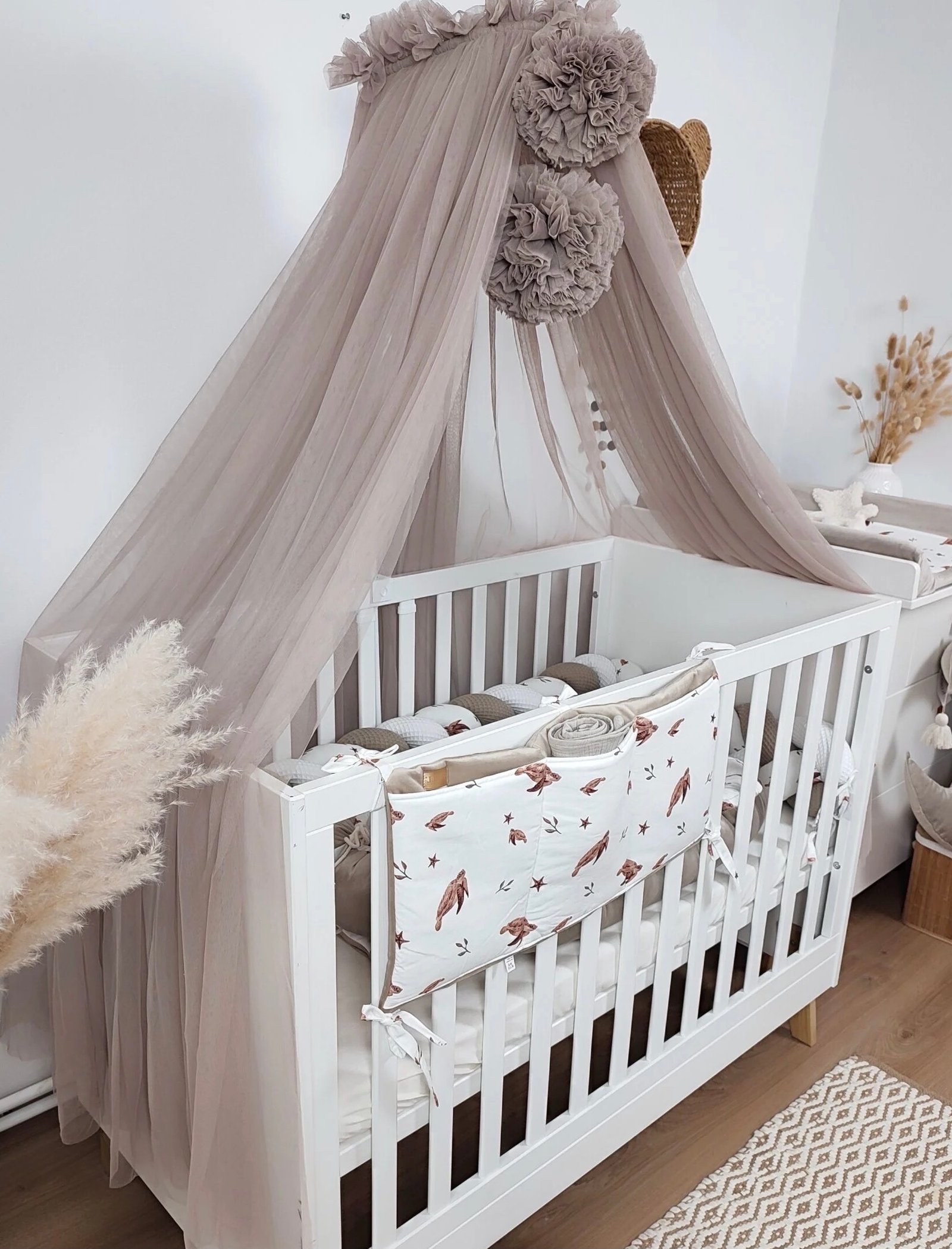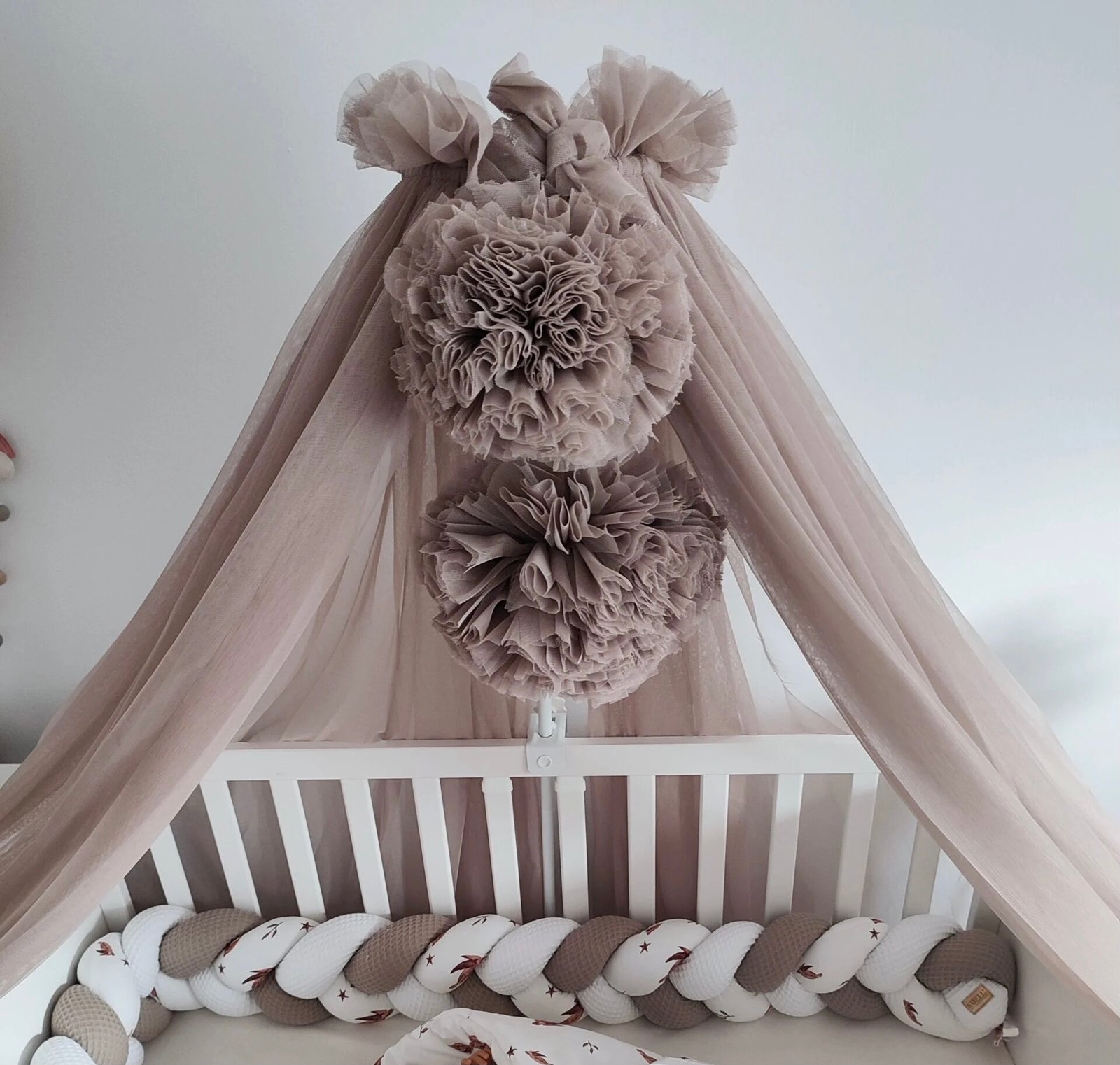 Page d'accueil > Shop > Ciel de lit en tulle taupe avec 2 pompons