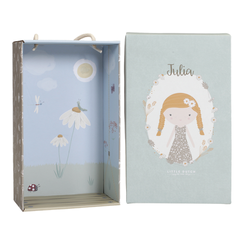 Voici Julia. Cette adorable poupée en peluche Little Dutch, vêtue d'une jolie robe, attend les câlins. Julia ' Middel ' mesure 35 cm ! Julia tient bien droite et se fera un plaisir de vous pousser dans la poussette en bois Little Dutch.