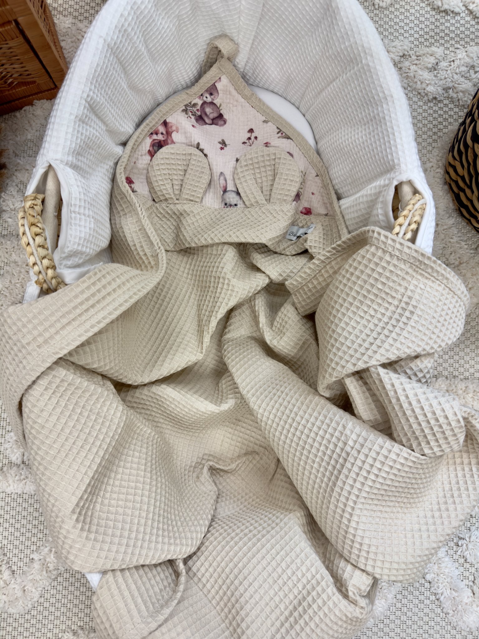 L'esclusivo telo da bagno BabyNest è molto morbido e assorbente. Il materiale waffle di cui è composto è un materiale double-face che è assorbente, traspirante, permeabile all'aria, riscaldante, ad asciugatura rapida e sicuro per i bambini. Il nostro asciugamano è adatto sia ai neonati che ai bambini più grandi.