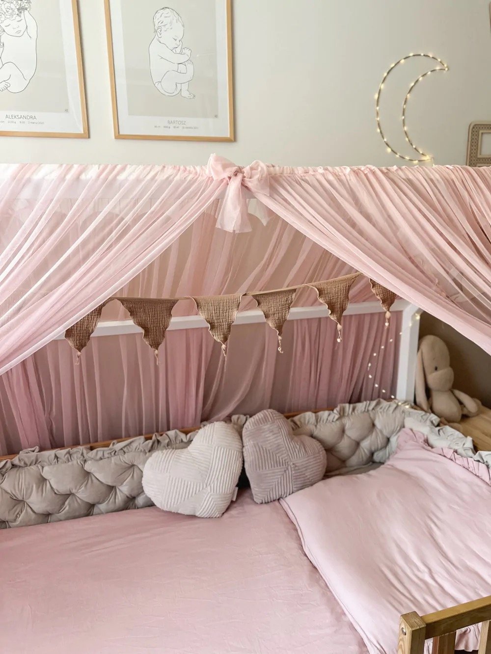 Unsere Vorhänge bestehen aus weichem, langlebigem Tüll, hergestellt von einem polnischen Qualitätshersteller und liebevoll in unserer hauseigenen Werkstatt genäht. Dank der Verwendung von rund 7 Metern Tüll pro Vorhang entsteht ein besonders voluminöser, beeindruckender „Wow“-Effekt – perfekt für unsere beliebten Hausbetten. - Inklusive dekorativer Schleifen