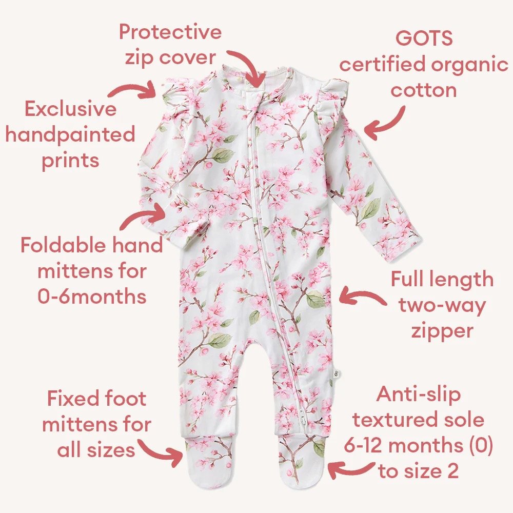 Cherry Blossom Organic Snuggle Sleepsuit Zip Footie with Frill