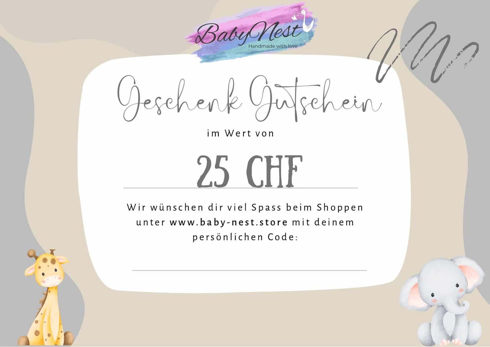 Beschenke deine Familie, Freunde oder Arbeitskollegen mit dem wunderbaren Geschenkgutschein von BabyNest. Dieser Gutschein wir dir per Mail zugestellt und kann selber ausgedruckt werden. Damit hast du immer ein Last-Minute Geschenk bereit.