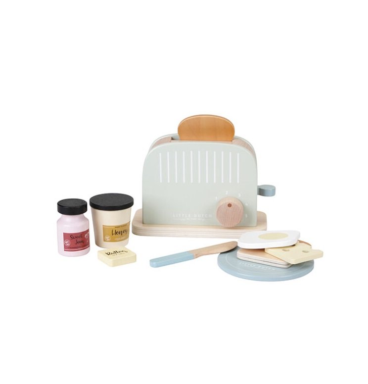 Guten Morgen. Worauf hast du Appetit? Serviere deinen Eltern oder deinen Lieblingspuppen ein leckeres Frühstück mit diesem Toaster-Set aus Holz. Leg die Brotscheiben in den Toaster und drück den Griff nach unten. Wenn die getoasteten Butterbrote herauskommen, sind sie servierfertig. Mit etwas Butter, Käse, Marmelade oder einem Spiegelei wird das Frühstück zu einem echten Genuss! Dieses Set enthält auch einen Holzteller und ein Messer. Kinder finden es toll, die täglichen Rituale ihrer Eltern zu imitieren - z.B. das Zubereiten des Frühstücks. Dieses Toasterset fördert das Rollenspiel und lässt sich gut mit der Kaffeemaschine aus Holz kombinieren.