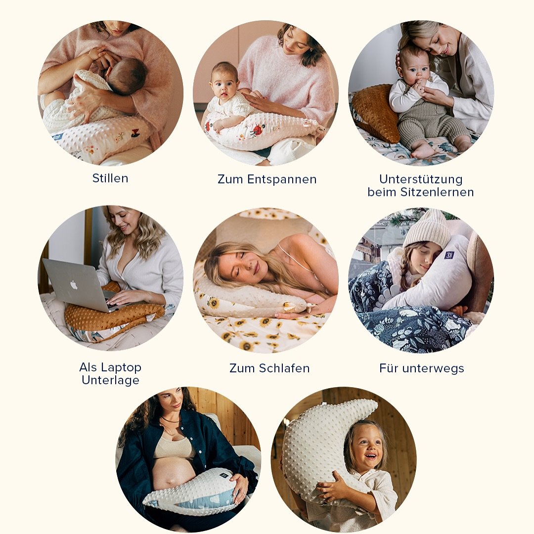 Ein weiches, elastisches und universelles Stillkissen. Die Henne von Oma Dana ist unser ikonisches Produkt und wird perfekt sein: während der Schwangerschaft, zum Schlafen und Ausruhen, dann wird es das perfekte Kissen zum Stillen oder Spielen mit Ihrem Baby sein. Auch auf Reisen oder bei der Arbeit ist unser Kissen super (Laptop-Auflage). Hergestellt aus weichem und elegantem Samt, gefüllt mit zertifiziertem, antiallergischem Polyesterball, wodurch es unglaublich elastisch ist und sich perfekt an unsere Bedürfnisse anpasst. Bei LM sagen wir immer, dass jeder seine eigene Henne haben sollte, also wählen Sie das perfekte Kissen für sich selbst und werden Sie sein nächster Liebhaber, wir versprechen Ihnen, dass Sie es vom ersten Gebrauch an lieben werden! Das Produkt ist für Kinder ab zwei Monaten geeignet und gemäss Sicherheitsstandards hergestellt.